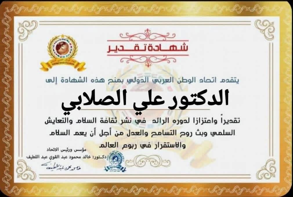 رئيس اتحاد الوطن العربي الدولي الدكتور خالد محمود عبد القوي عبد اللطيف يمنح شهادة تقدير للدكتور علي الصلابيitihadworld13/12/2025تكريمات