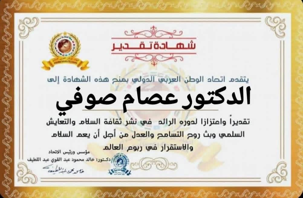 رئيس اتحاد الوطن العربي الدولي الدكتور خالد محمود عبد اللطيف يمنح شهادة تقدير لعضو مكتب تنفيذي في غرفة تجارة وصناعة في مدينة اللاذقيةitihadworld13/12/2025تكريمات