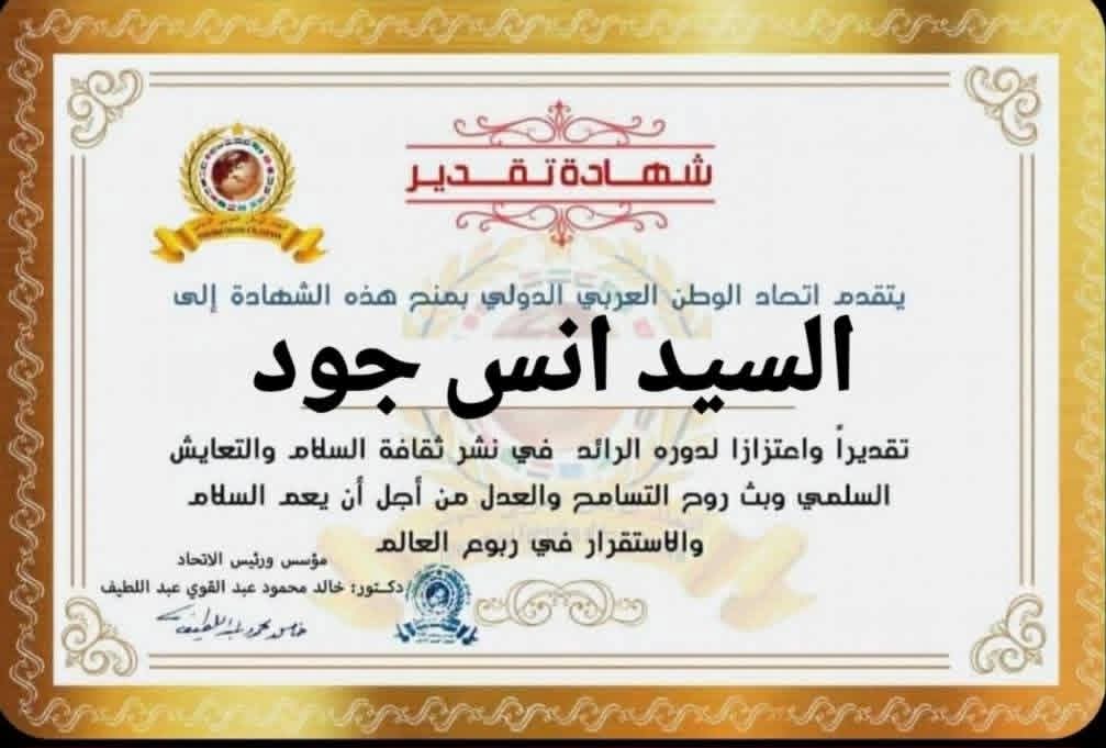 رئيس اتحاد الوطن العربي الدولي الدكتور خالد محمود عبد اللطيف يمنح شهادة تقدير للسيد رئيس غرفة تجارة وصناعة مدينة اللاذقيةitihadworld13/12/2025تكريمات