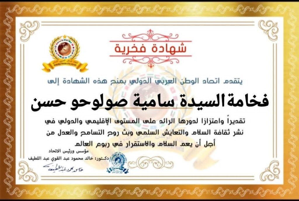 رئيس اتحاد الوطن العربي الدولي الدكتور خالد محمود عبد اللطيف يمنح شهادة فخرية لفخامة السيدة رئيسة تنزانيا المتحدة