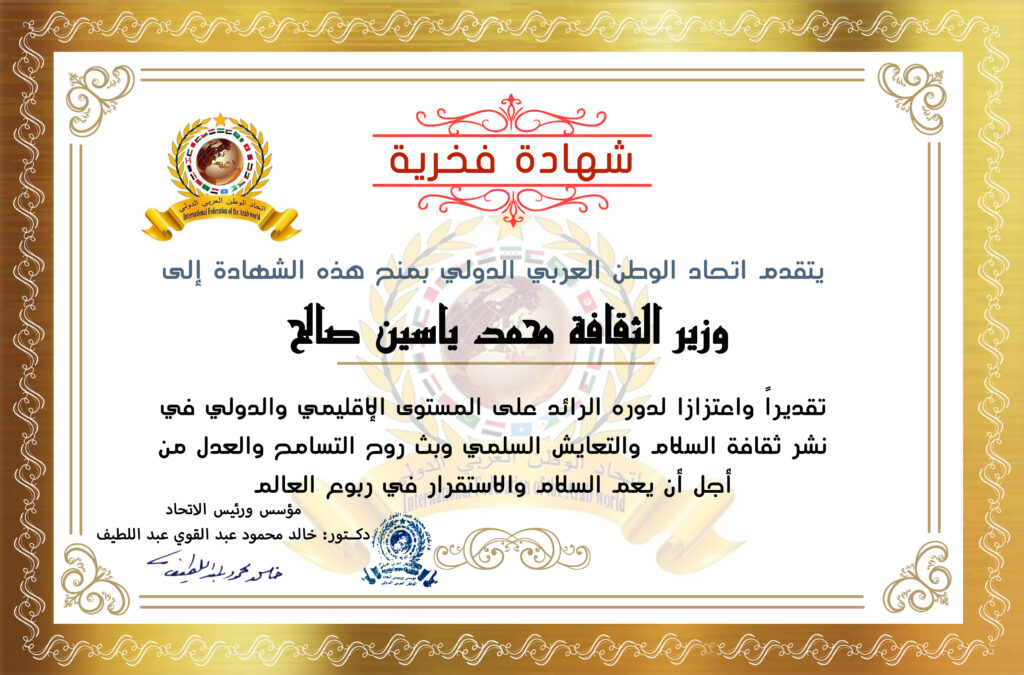 رئيس اتحاد الوطن العربي الدولي الدكتور خالد محمود عبد القوي عبد اللطيف يمنح شهادة فخرية للسيد وزير الثقافةitihadworld11/12/2025تكريمات