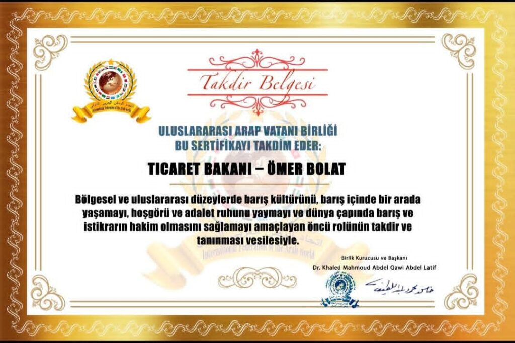 رئيس اتحاد الوطن العربي الدولي الدكتور خالد محمود عبد اللطيف يمنح شهادة فخرية للسيد الوزير عمر بولات وزير التجارة بالجمهورية التركيةitihadworld21/12/2025تكريمات