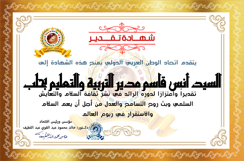 رئيس اتحاد الوطن العربي الدولي الدكتور خالد محمود عبد القوي عبد اللطيف يمنح شهادة تقدير للسيد أنس قاسم مدير التربية والتعليم بمحافظة حلبitihadworld10/03/2026تكريمات