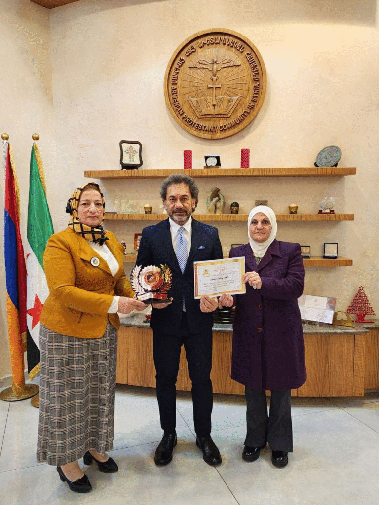 رئيس اتحاد الوطن العربي الدولي يتحدث مع القس الدكتور هاورتيون سليميان رئيس طائفة الأرمن الإنجيلي البروتستانت عن استراتيجية الإتحاد في نشر ثقافة السلام والتعايش السلمي