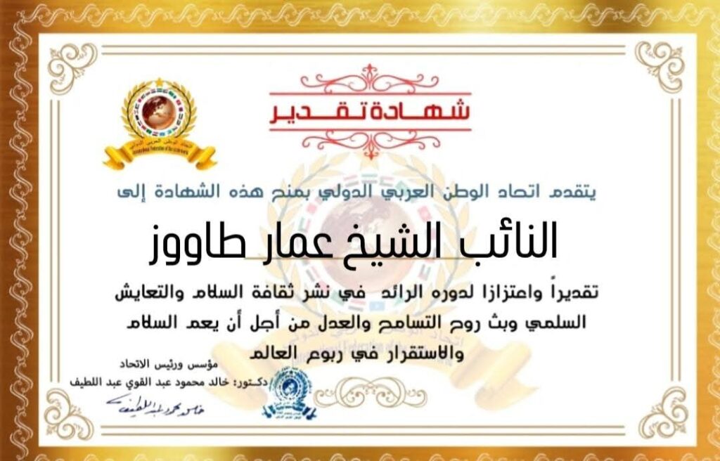 رئيس اتحاد الوطن العربي الدولي يمنح شهادة تقديرللنائب الشيخ عمار طاووز عضو مجلس الشعب بالجمهوريةالعربية السورية