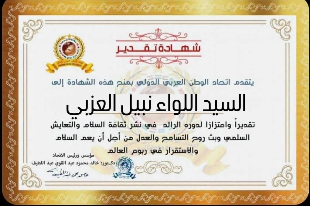 رئيس اتحاد الوطن العربي الدولي يمنح شهادة تقديرللواء نبيل العزبي محافظ محافظة أسيوط الأسبق بجمهورية مصر العربيةitihadworld24/12/2025تكريمات