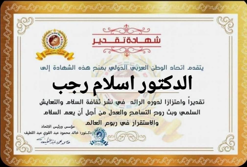 رئيس اتحاد الوطن العربي الدولي يمنح شهادة تقديرللدكتور إسلام رجب نائب المحافظ لمحافظةمطروح بجمهورية مصر العربية
