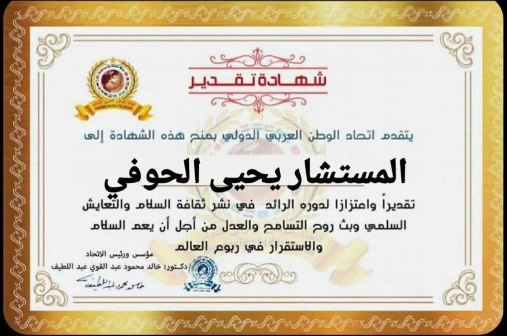 رئيس اتحاد الوطن العربي الدولي يمنح شهادة تقديرللمستشار يحيى الحوفي رئيس فرع هيئة قضايا الدولةبمحافظة مطروح بجمهورية مصر العربية