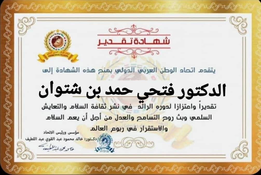 رئيس اتحاد الوطن العربي الدولي يمنح شهادة تقديرللدكتور فتحي حمد بن شتوان وزير الطاقة والصناعةالأسبق بدولة ليبياitihadworld24/12/2025تكريمات