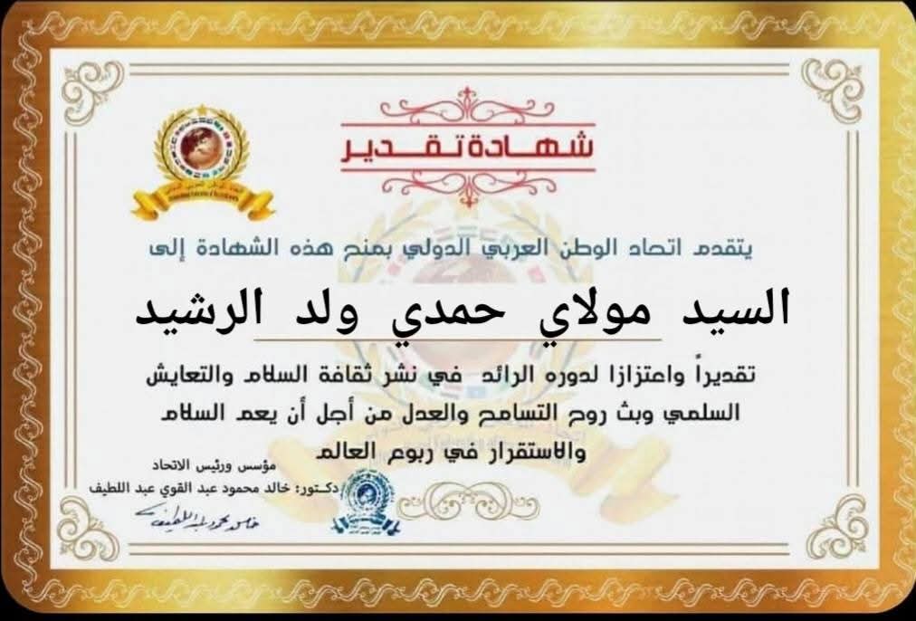 رئيس اتحاد الوطن العربي الدولي يمنح شهادة تقديرللسيد مولاي حمدي ولد الرشيد رئيس مجلس جماعةالعيون بالمملكة المغربية