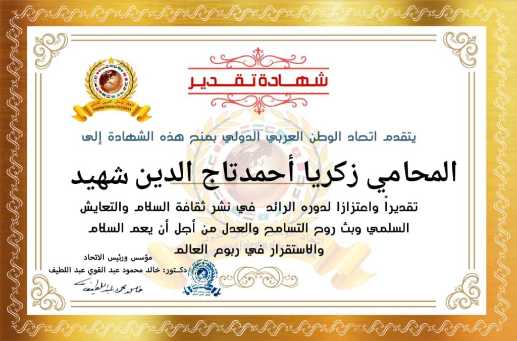 رئيس اتحاد الوطن العربي الدولي يمنح شهادة تقدير للمحامي زكريا احمد تاج الدين شهيد عضو مجلس فرع نقابة المحامين بمحافظة حلب في الجمهورية العربية السوريةitihadworld30/01/2026تكريمات