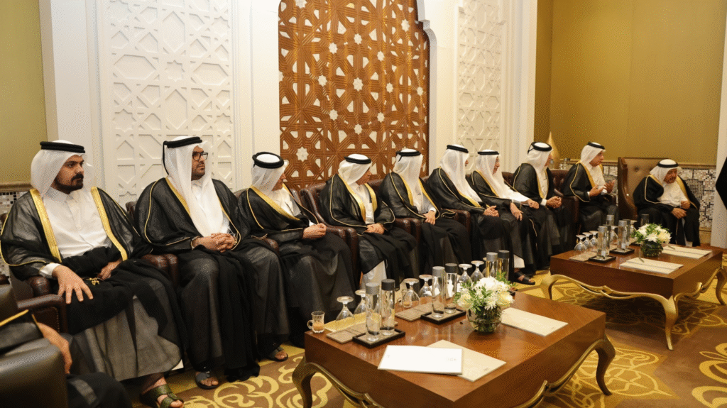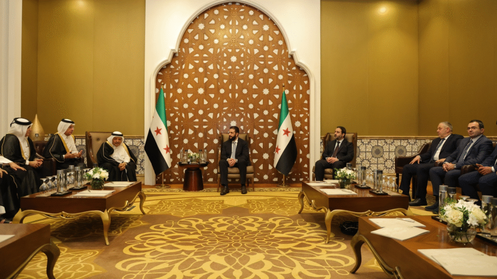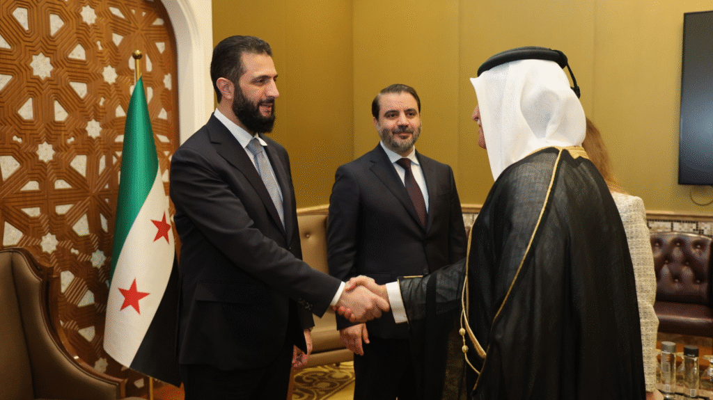 عقد السيّد الرئيس أحمد الشرع جلسةً في العاصمة القطرية الدوحة مع رابطة رجال الأعمال القطريين، برئاسة سعادة الشيخ فيصل بن قاسم آل ثاني، رئيس الرابطة، وعددٍ من الأعضاء، وذلك على هامش أعمال منتدى الدوحة 2025، وبحضور وزير الخارجية والمغتربين السيد أسعد الشيباني.
