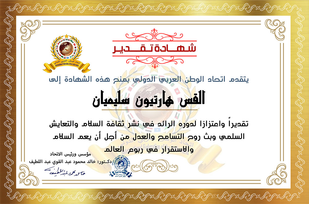 رئيس اتحاد الوطن العربي الدولي الدكتور خالد محمود عبد اللطيف يمنح شهادة تقديرللقس هارتيون سليميانItihadworld-W10/12/2025تكريمات