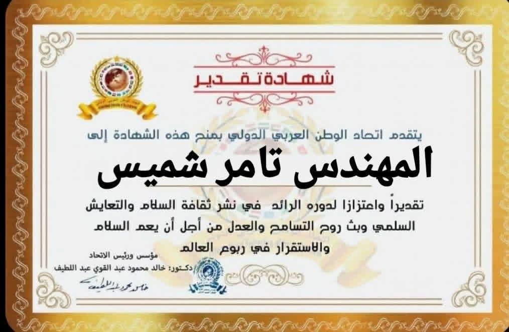 مؤسس ورئيس اتحاد الوطن العربي الدولي يمنح شهادة تقديرللمهندس تامر شميس رئيس قطاع المكتب الفني لرئيس مجلس ادارة المحطات النووية بجمهورية مصر العربيةitihadworld24/12/2025تكريمات