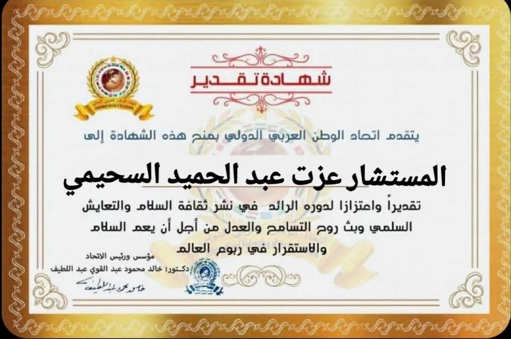 مؤسس ورئيس اتحاد الوطن العربي الدولي يمنح شهادة تقديرللمستشار عزت عبدالحميد علي السحيمي مدير المكتب القضائي لهيئة قضايا الدولة بالديوان العام لمحافظة الغربية بجمهورية مصر العربيةitihadworld24/12/2025تكريمات