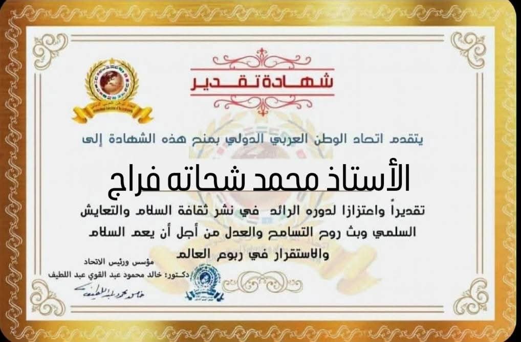 مؤسس ورئيس اتحاد الوطن العربي الدولي يمنح شهادة تقدير للأستاذ محمد شحاته فراج رئيس مجلس إدارة مجموعة شركات جليم باي وذاووك للتنمية السياحيةitihadworld10/03/2026تكريمات