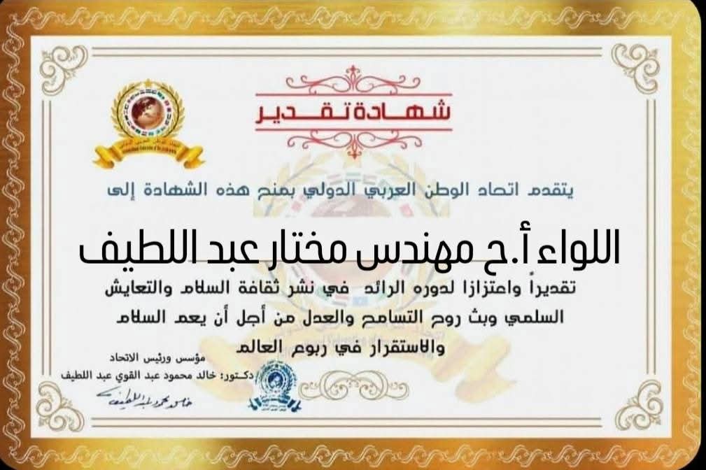مؤسس ورئيس اتحاد الوطن العربي الدولي يمنح شهادة تقدير للواء أركان حرب مهندس مختار عبد اللطيف رئيس الهيئة العربية للتصنيع بجمهورية مصر العربيةitihadworld11/03/2026تكريمات