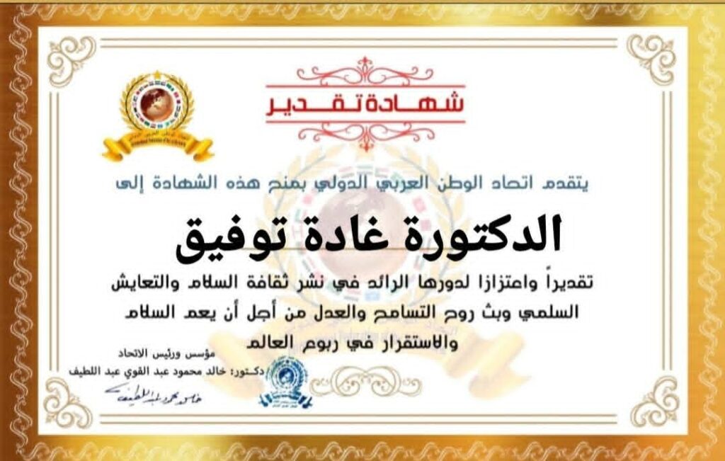 مؤسس ورئيس اتحاد الوطن العربي الدولي يمنح شهادة تقديرللدكتورة غادة توفيق مستشار محافظ البنك المركزي بجمهورية مصر العربيةitihadworld26/12/2025تكريمات