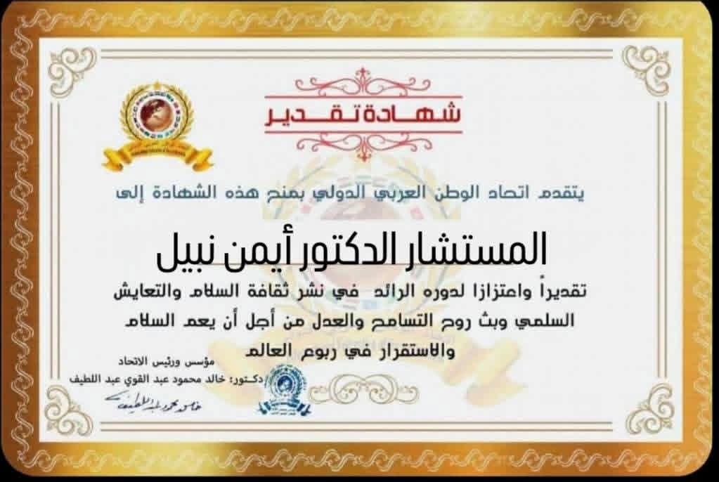 مؤسس ورئيس اتحاد الوطن العربي الدولي يمنح شهادة تقدير للمستشار الدكتور أيمن نبيل مدير مركز التدريب القضائي بهيئة النيابة الإدارية بجمهورية مصر العربية