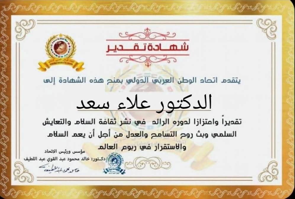 مؤسس ورئيس اتحاد الوطن العربي الدولي يمنح شهادة تقدير للدكتور علاء سعد المستشار القانوني للقنصلية اليونانية بالإسكندرية بجمهورية مصر العربيةitihadworld11/03/2026تكريمات