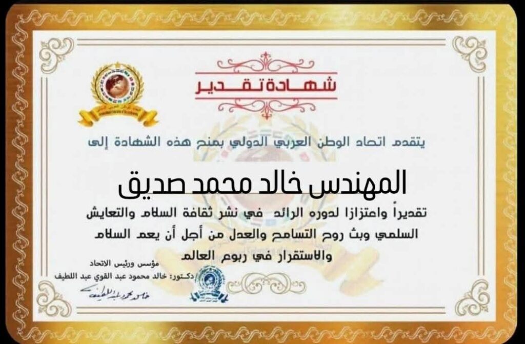 مؤسس ورئيس اتحاد الوطن العربي الدولي يمنح شهادة تقدير للمهندس خالد محمد صديق مساعد وزير الإسكان والمرافق والمجتمعات العمرانية الجديدة والمشرف على مكتب الوزيرة بجمهورية مصر العربيةitihadworld12/03/2026تكريمات