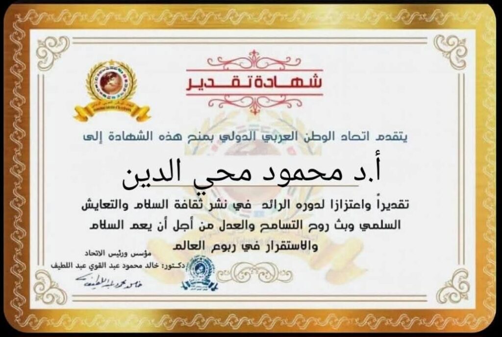 مؤسس ورئيس اتحاد الوطن العربي الدولي يمنح شهادة تقدير للأستاذ الدكتور محمود محي الدين رئيس جامعة فاروس بجمهورية مصر العربيةitihadworld12/03/2026تكريمات