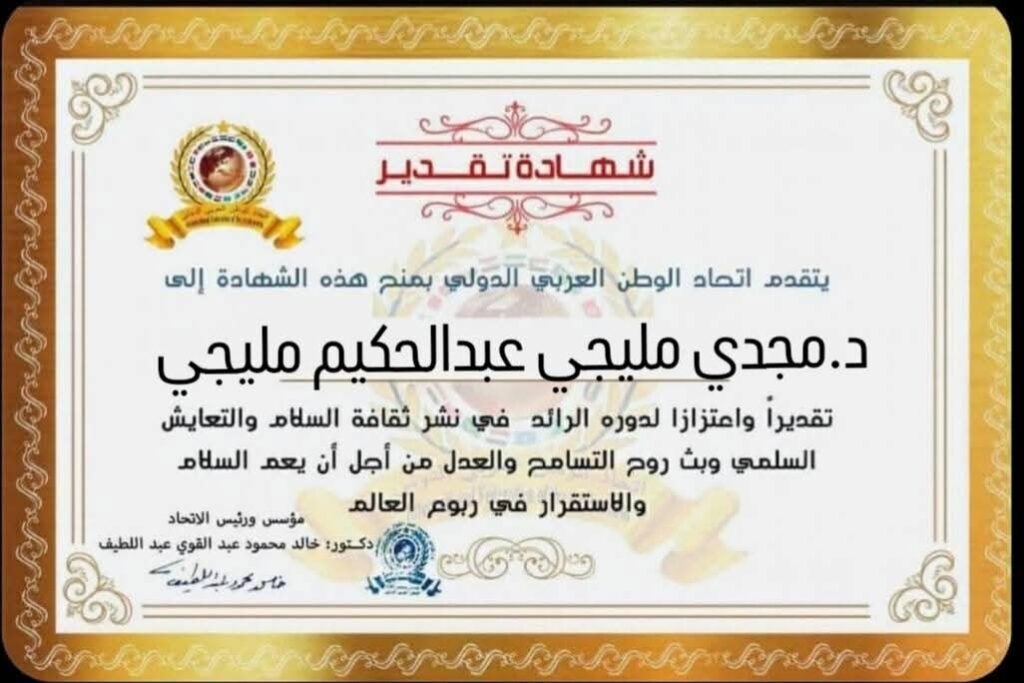 مؤسس ورئيس اتحاد الوطن العربي الدولي يمنح شهادة تقدير للدكتور مجدي مليجي عبد الحكيم مليجي عميد كلية التجارة جامعة بنها بجمهورية مصر العربية