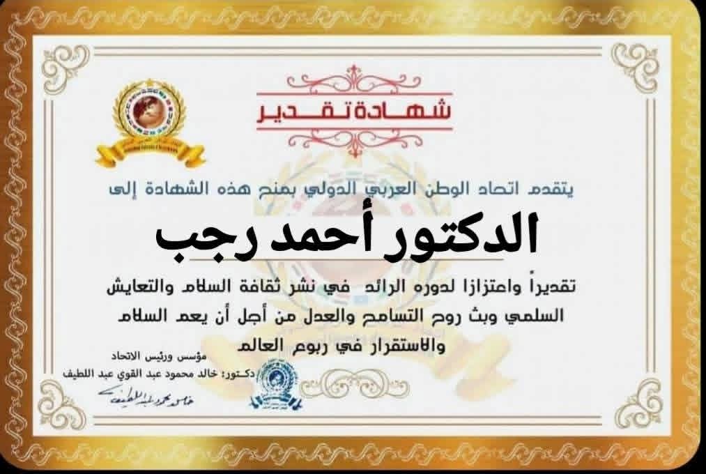 مؤسس ورئيس اتحاد الوطن العربي الدولي يمنح شهادة تقدير للدكتور أحمد رجب نائب رئيس جامعة القاهرةitihadworld26/12/2025تكريمات