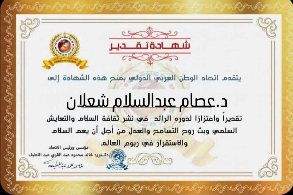 مؤسس ورئيس اتحاد الوطن العربي الدولي يمنح شهادة تقدير للدكتور عصام عبد السلام عبدالحليم شعلان عميد كلية العلوم جامعة أسوان بجمهورية بجمهورية مصر العربية