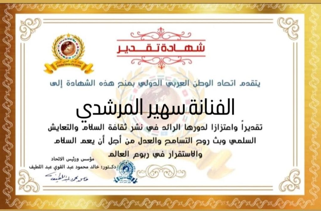 مؤسس ورئيس اتحاد الوطن العربي الدولي يمنح شهادة تقدير للفنانة سهير المرشدي رئيس مجلس إدارة جمعية أنصار التمثيل والسينما بجمهورية مصر العربية