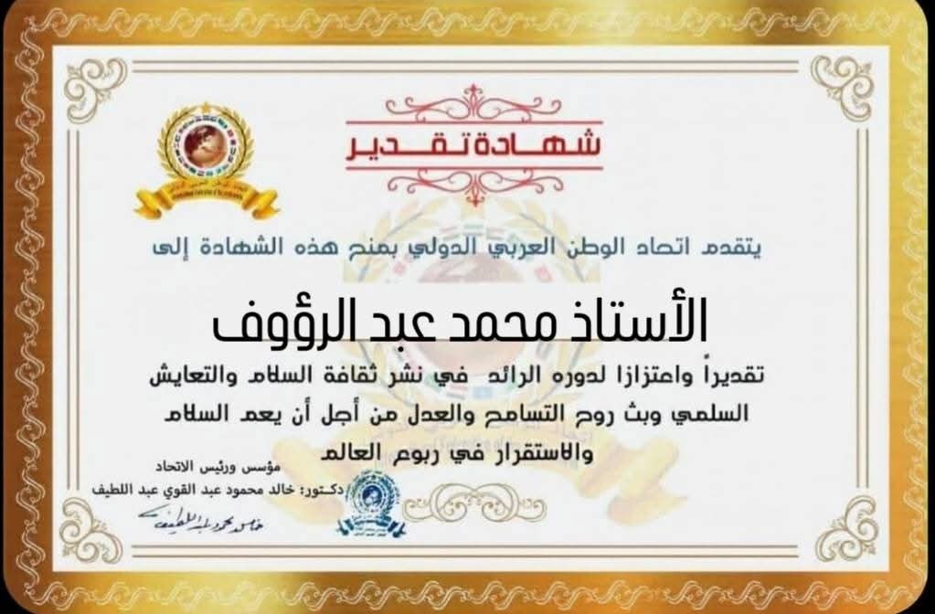 مؤسس ورئيس اتحاد الوطن العربي الدولي يمنح شهادة تقدير للأستاذ محمد عبد الرؤوف مدير البنك الأهلي بالإسكندرية فرع المنتزة بجمهورية مصر العربية