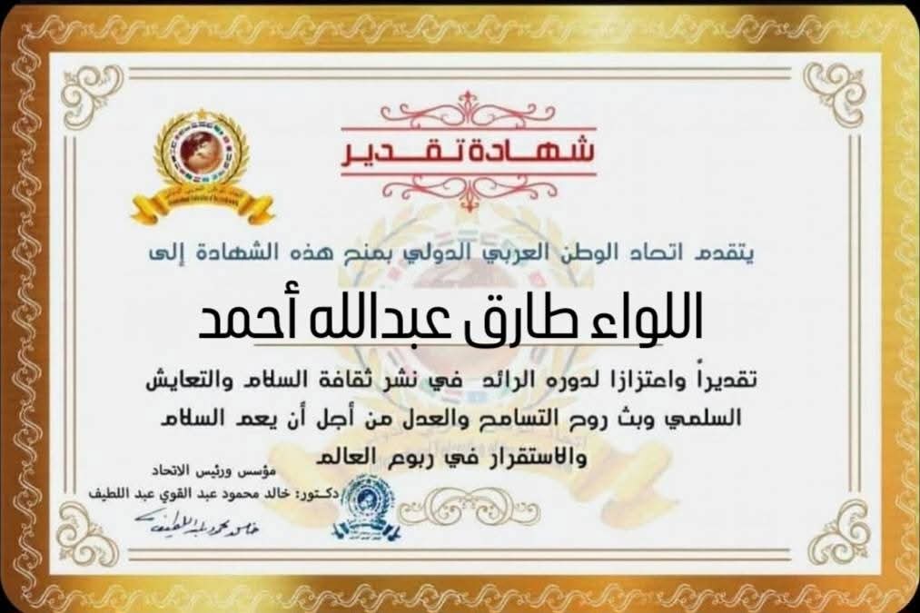 مؤسس ورئيس اتحاد الوطن العربي الدولي يمنح شهادة تقدير للواء طارق عبدالله أحمد رئيس قطاع النقل البحري واللوجستيات بجمهورية مصر العربيةطitihadworld14/03/2026مقالات
