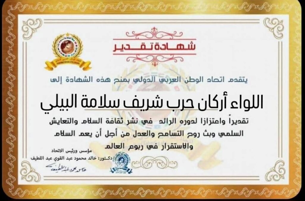 مؤسس ورئيس اتحاد الوطن العربي الدولي يمنح شهادة تقدير للواء أركان حرب شريف سلامة البيلي نائب وزير النقل والمواصلات بجمهورية مصر العربيةitihadworld15/03/2026تكريمات