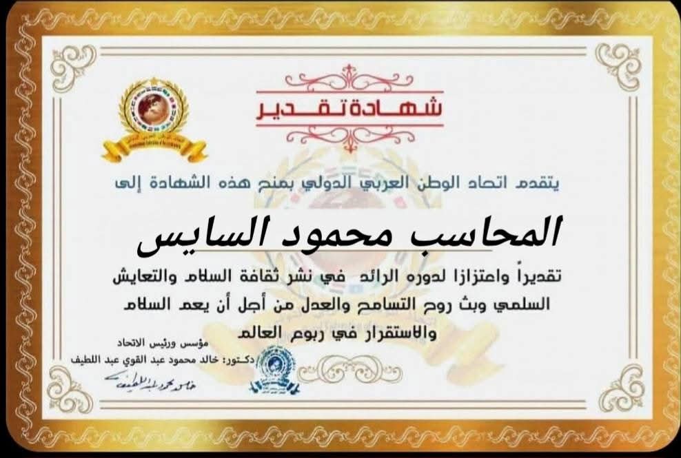 مؤسس ورئيس اتحاد الوطن العربي الدولي يمنح شهادة تقدير للمحاسب محمود السايس رئيس قطاع الشؤون المالية