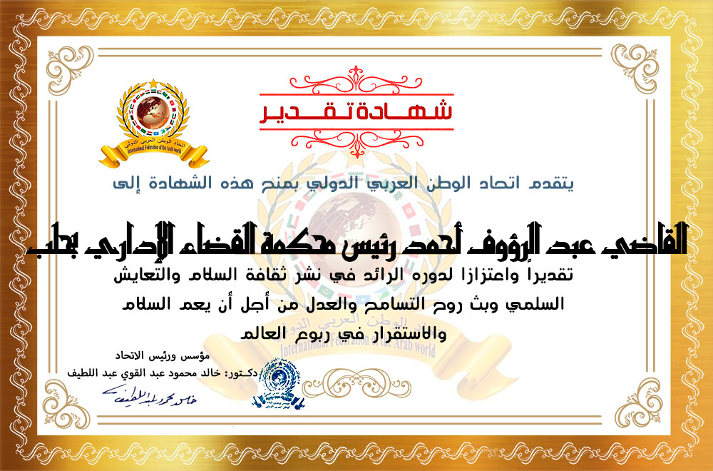مؤسس ورئيس اتحاد الوطن العربي الدولي الدكتور خالد محمود عبد القوي عبد اللطيف يمنح رئيس محكمة القضاء الإداري بحلب القاضي المستشار عبد الرؤوف أحمدitihadworld16/03/2026تكريمات