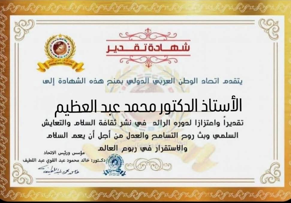 مؤسس ورئيس اتحاد الوطن العربي الدولي يمنح شهادة تقدير للأستاذ الدكتور محمد عبد العظيم رئيس جامعة المنصورة الأهلية بجمهورية مصر العربيةitihadworld17/03/2026تكريمات