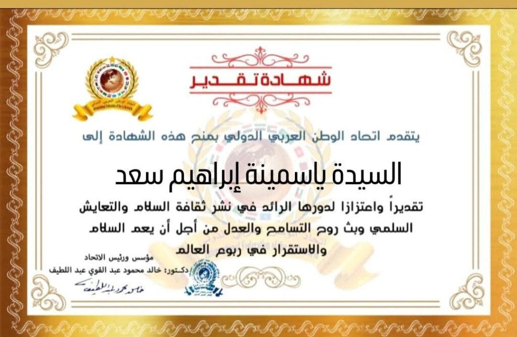 مؤسس ورئيس اتحاد الوطن العربي الدولي يمنح شهادة تقدير للسيدة ياسمينة إبراهيم سعد القنصل العام المكلف لدولة ليبيا بالإسكندرية بجمهورية مصر العربيةitihadworld18/03/2026تكريمات