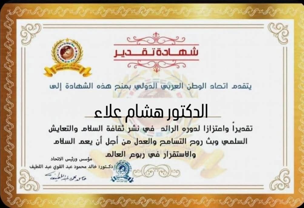 مؤسس ورئيس اتحاد الوطن العربي الدولي يمنح شهادة تقدير للدكتور هشام علاء مدير مكتب المقاولون العرب بالمركز الطيي للمقاولون العرب بجمهورية مصر العربية