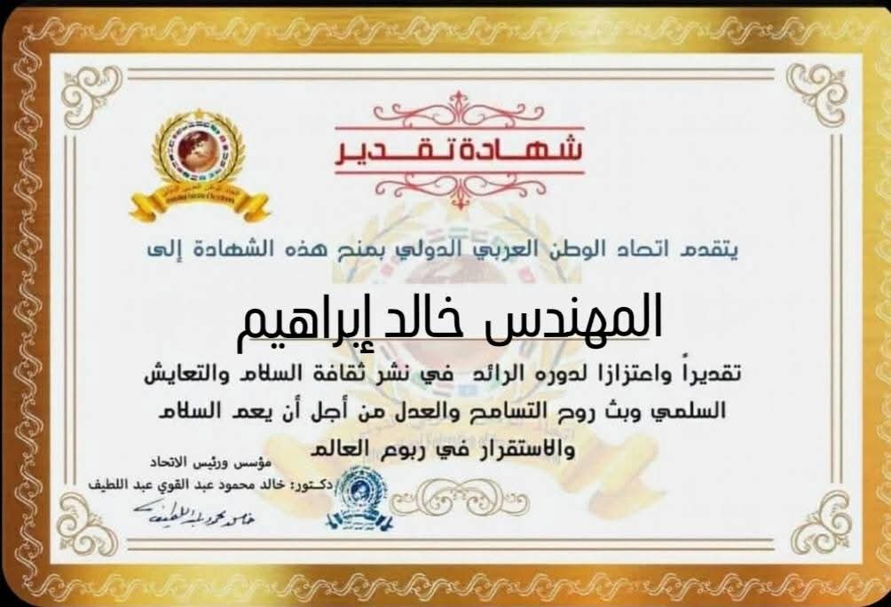 مؤسس ورئيس اتحاد الوطن العربي الدولي يمنح شهادة تقدير للمهندس خالد إبراهيم رئيس شركة إنبي بوزارة البترول بجمهورية مصر العربيةitihadworld19/03/2026تكريمات