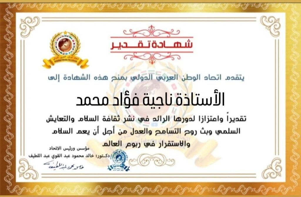 مؤسس ورئيس اتحاد الوطن العربي الدولي يمنح شهادة تقدير للأستاذة ناجية فؤاد محمد وكيل إدارة الجمرك بمديرية التربية والتعليم بالإسكندرية بجمهورية مصر العربيةitihadworld19/03/2026تكريمات