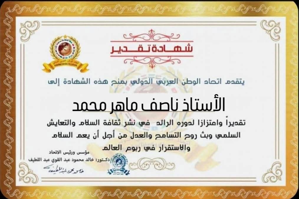 مؤسس ورئيس اتحاد الوطن العربي الدولي يمنح شهادة تقدير للأستاذ ناصف ماهر محمد وكيل إدارة برج العرب بمديرية التربية والتعليم بالإسكندرية بجمهورية مصر العربية
