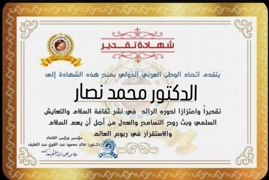 مؤسس ورئيس اتحاد الوطن العربي الدولي يمنح شهادة تقدير للدكتور محمد نصار مدير عام الإدارة العامة لشؤون المساجد بوزارة الأوقاف المصرية