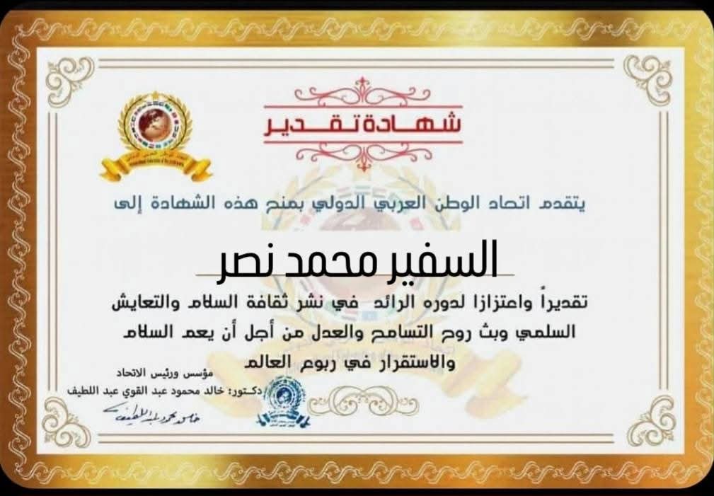 مؤسس ورئيس اتحاد الوطن العربي الدولي يمنح شهادة تقدير للسفير محمد نصر سفير جمهورية مصر العربية لدى النمسا والمندوب الدائم لدى المنظمات الدوليةitihadworld21/03/2026تكريمات