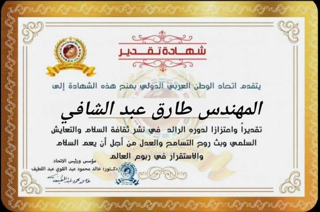 مؤسس ورئيس اتحاد الوطن العربي الدولي يمنح شهادة تقدير للمهندس طارق عبد الشافي رئيس مجلس الإدارة والعضو المنتدب لشركة جنوب القاهرة لتوزيع الكهرباءitihadworld27/12/2025تكريمات