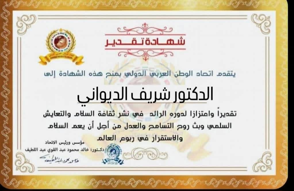 مؤسس ورئيس اتحاد الوطن العربي الدولي يمنح شهادة تقدير للدكتور شريف الديواني المستشار الاقتصادي لجمعية رجال الاعمال بالإسكندرية بجمهورية مصر العربيةitihadworld24/03/2026تكريمات