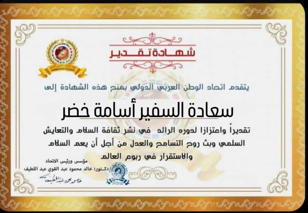 مؤسس ورئيس اتحاد الوطن العربي الدولي يمنح شهادة تقدير لسعادة السفير أسامة خضر سفير جمهورية مصر العربية لدى الجمهورية العربية السوريةitihadworld27/03/2026تكريمات