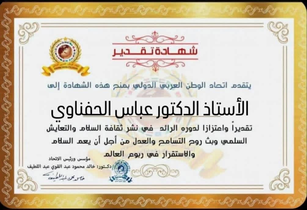 مؤسس ورئيس اتحاد الوطن العربي الدولي يمنح شهادة تقدير للأستاذ الدكتور عباس الحفناوي رئيس جامعات المنوفية والدلتا وجامعة السلام الأسبق وعضو الإتحادitihadworld27/03/2026تكريمات