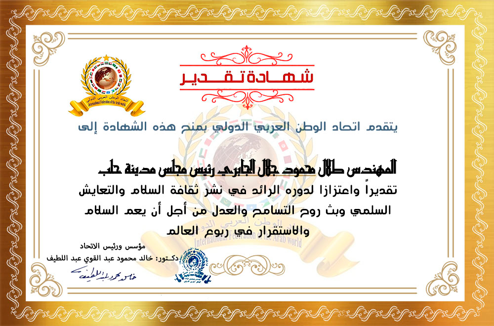 مؤسس ورئيس اتحاد الوطن العربي الدولي الدكتور خالد محمود عبد القوي عبد اللطيف يمنح شهادة تقدير لرئيس مجلس مدينة حلب المهندس طلال محمود جلال الجابري رئيس مجلس مدينة حلب بالجمهورية العربية السوريةitihadworld28/03/2026تكريمات