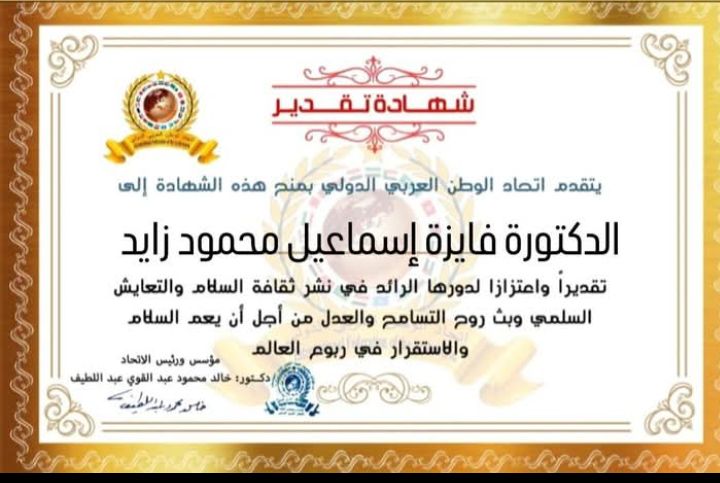 مؤسس ورئيس اتحاد الوطن العربي الدولي يمنح شهادة تقدير للدكتورة فايزة إسماعيل محمود زايد مدير مديرية التضامن الأجتماعي بمحافظة بالبحيرة بوزارة التضامن الأجتماعي بجمهورية مصر العربيةitihadworld30/03/2026تكريمات