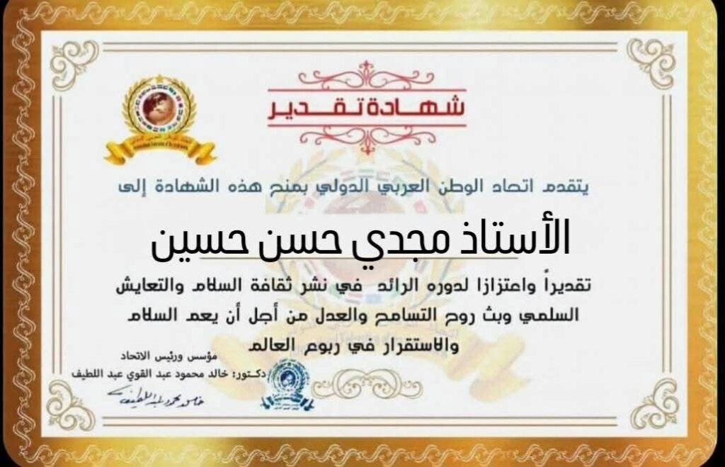 مؤسس ورئيس اتحاد الوطن العربي الدولي يمنح شهادة تقدير للأستاذ مجدي حسن حسين مدير مديرية التضامن الأجتماعي بمحافظة السويس بوزارة التضامن الأجتماعي بجمهورية مصر العربية
